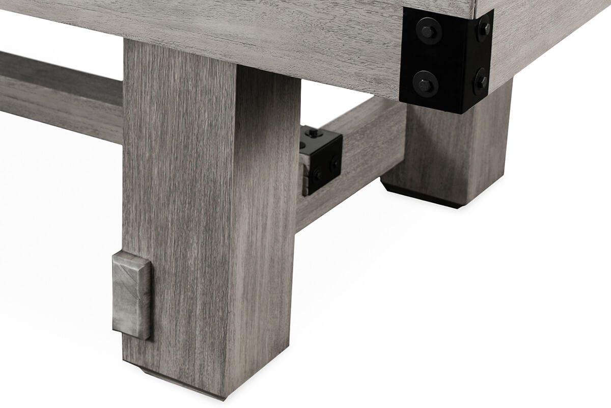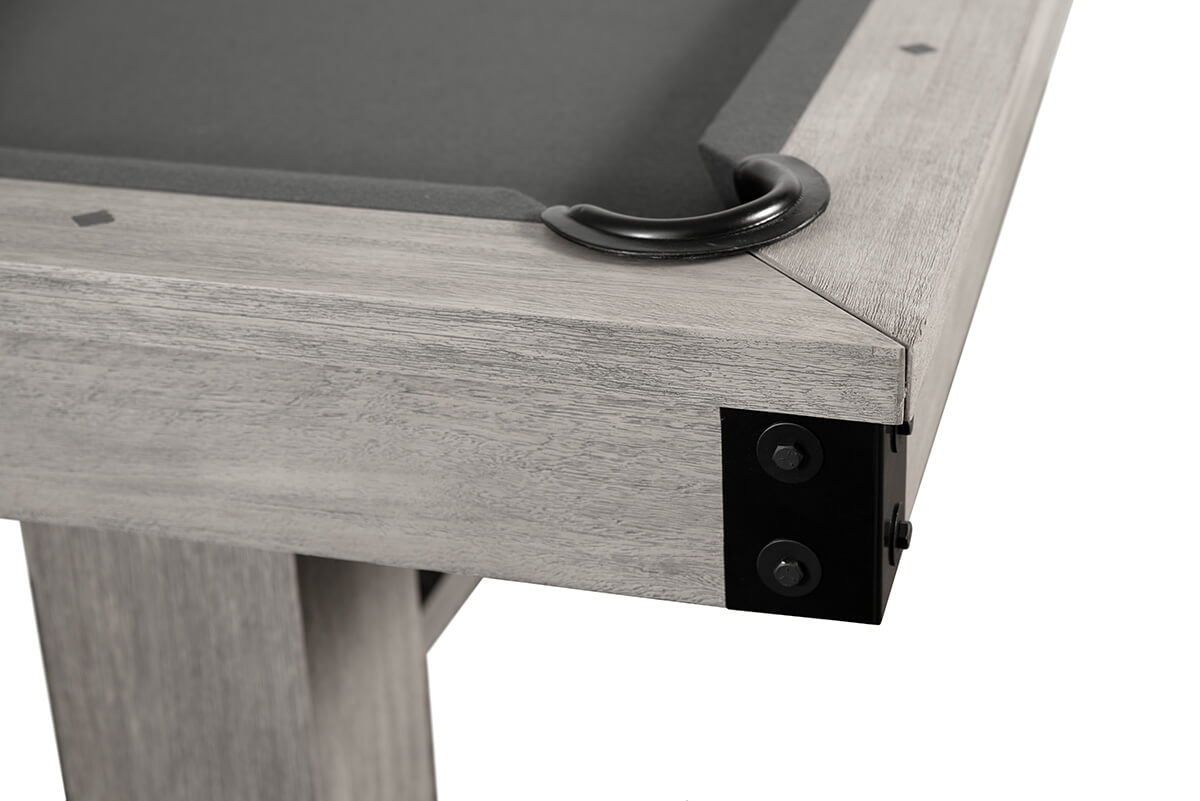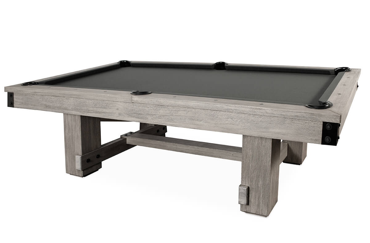 The Silverton rustic wood pool table is incredibly sturdy & comes with metal accents on the corners & stretchers. The Silverton is manufactured out of African Hardwood, & this pool table is built to withstand the demands of an active family. The unique barndoor gray finish creates a subtle, natural look.
